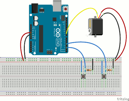 Now that we've introduced both servos and buttons, let's see how they can be combined. Debouncing won't be necessary because the servo is already not very responsive.
