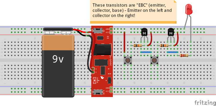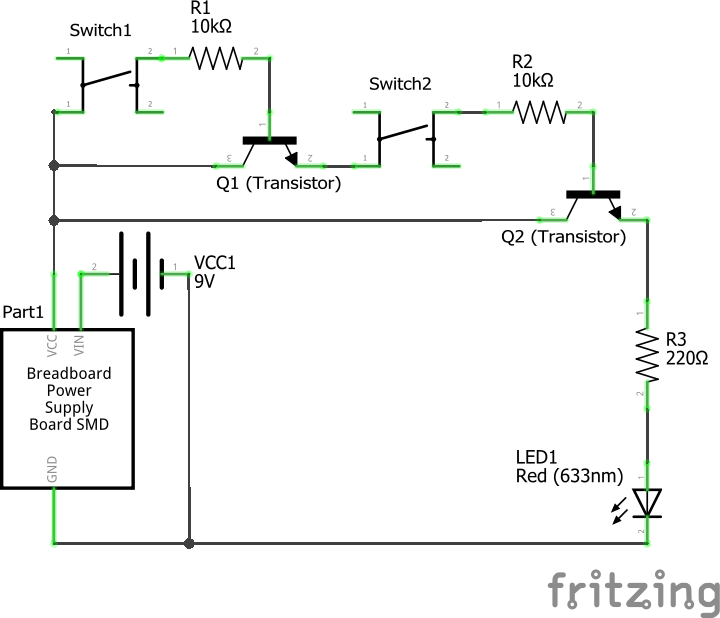 Let's look at a circuit that uses transistors. This circuit will implement the logical AND operation using two buttons for input and one LED for output. The LED is off by default. If you press button 1 or button 2, the LED remains off. But if you press both button 1 and button 2, the LED will light up. Thus, the AND gate.